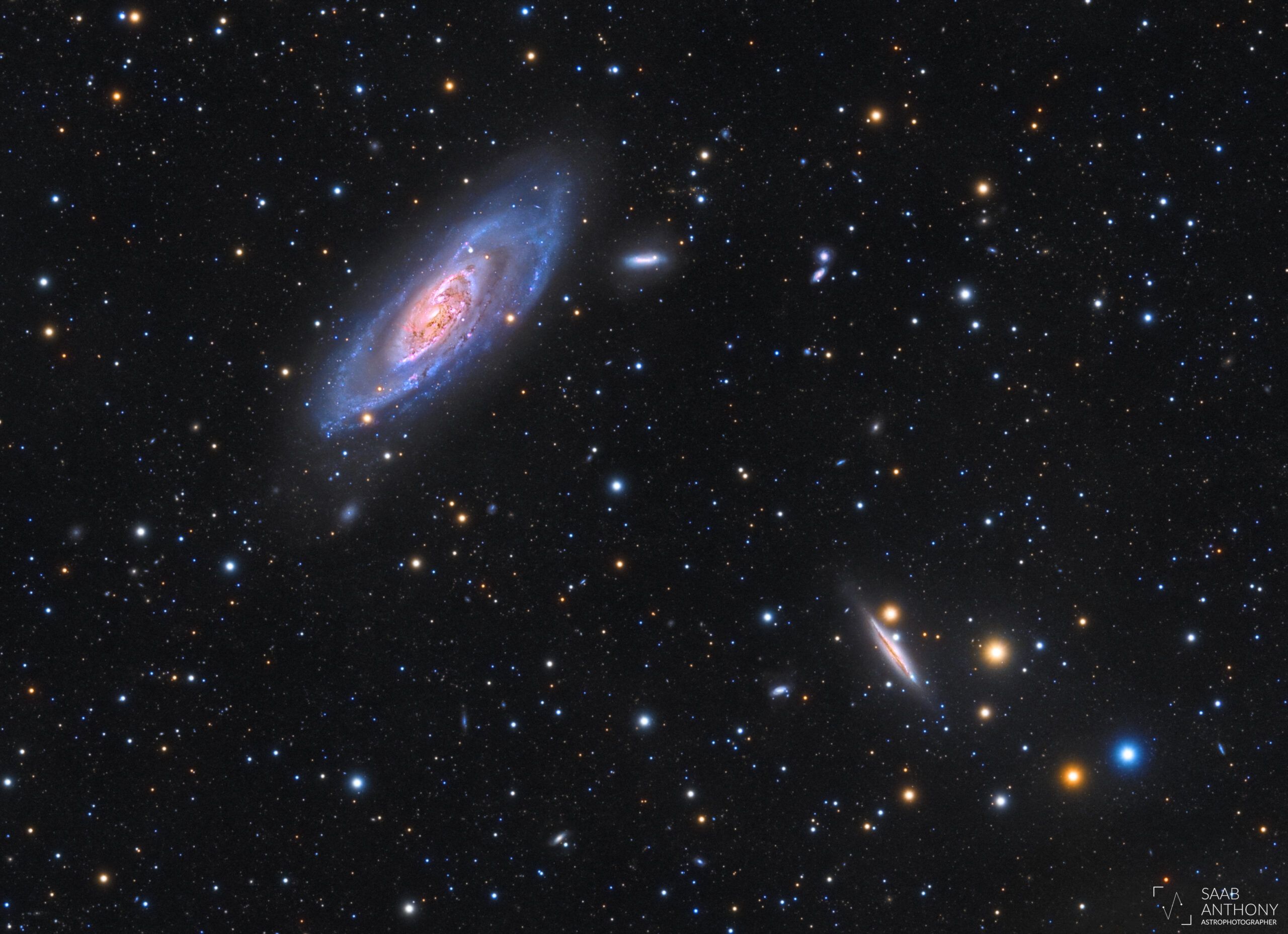 Lying just a few arcminutes away from M106, NGC 4217 is a spiral galaxy viewed edge-on, located about 60 million light-years from Earth. Its slender profile reveals a prominent dust lane cutting through the galactic disk — a beautiful contrast to the face-on view of M106. While not physically associated with M106, the two galaxies form a compelling visual pairing in wide-field images.